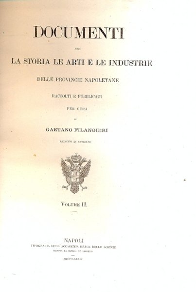Documenti per la storia , le arti e le industrie delle provincie napoletane. Raccolti e pubblicati per cura di Gaetano Filangieri Principe di Satriano. | Libri antichi e moderni | Campania - Filangieri Gaetano.