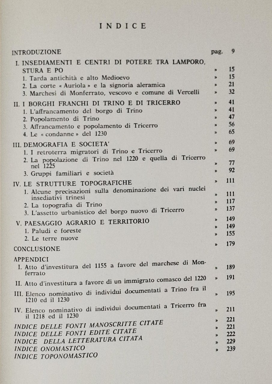 Biblioteca della Società Storica Vercellese. Pagine: 243. Formato: 17 x 24 cm circa. Stato di conservazione: ottimo esemplare, pari al nuovo. Copertina editoriale flessibile. Indice dei grandi capitoli: introduzione, I- Insediamenti e centri di potere tra Lamporo, Stura e Po, II- I borghi franchi di Trino e di Tricerro, III- Demografia e società, IV- Le strutture topografiche, V- Paesaggio agrario e territorio, Conclusione, Appendici, indici.