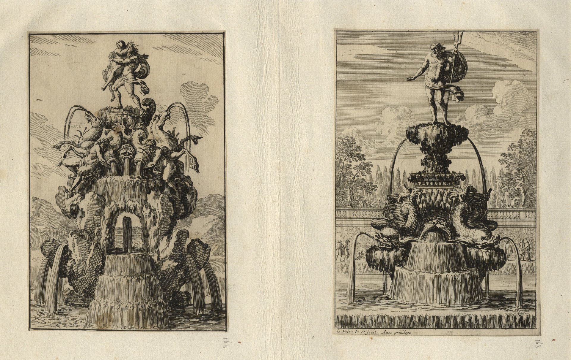 Due incisioni raffiguranti due fontane barocche.