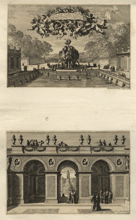 A Paris, chez Pierre Mariette, [seconda metà del XVII secolo], due acqueforti, rifilate all'immagine, mm 157x235 circa ciascuna. Montate su un grande foglio intero di carta vergellata settecentesca (il foglio: mm 435x578 circa). Una incisione reca i dati editoriali in un ricco cartiglio barocco. Il foglio con le due incisioni: