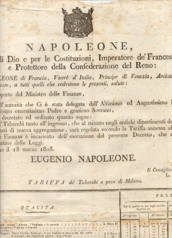 Editto napoleonico che decreta la tariffa de' tabacchi a peso di Milano. | Libri antichi e moderni | Napoleone Eugenio.
