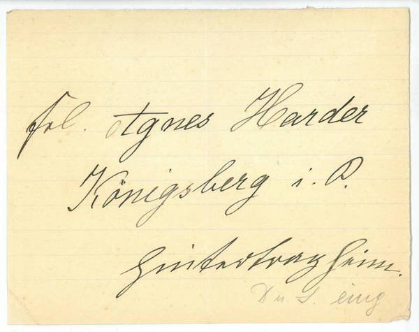 Eigenh. Adresse mit eigenh. Namenszug. | Libri antichi e moderni | Harder, Agnes, Schriftstellerin (1864-1939).