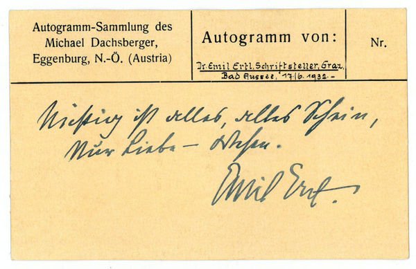 1 S. Qu.-8vo. “Nichtig ist alles, alles Schein, Nur Liebe - Wesen”. - Emil Ertl war seit 1889 Bibliothekar der TH Graz. Die Freundschaft mit Peter Rosegger brachte ihn als einen “der bedeutendsten Vertreter des österreichischen Heimat- und Geschichtsromans” (Öst. Lex. I, 298) zur Synthese von naturalistischer Milieuschilderung und gemütvollem Humor. Vgl. auch Kosch IV, 490f. - Aus der “Autogramm-Sammlung des Michael Dachsberger, Eggenburg, N.-Ö.” (so auf der Textseite gedr.) und mit montiertem, den Schriftsteller als Brustbild abbildenden Zeitungsausschnitt auf der Bildseite.