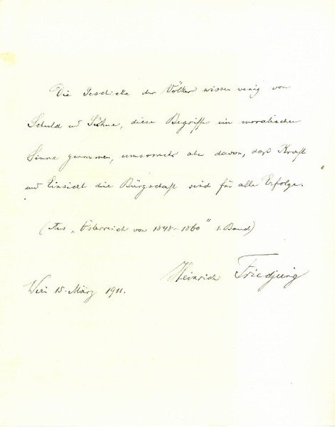 1 S. 4to. Die Geschicke der Völker wissen wenig von Schuld und Sühne, diese Begriffe im moralischen Sinne genommen, umsomehr aber davon, daß Kraft und Einsicht die Bürgschaft sind für alle Erfolge (aus Österreich von 1848-1860)".