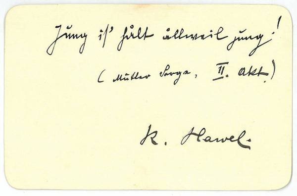 1 S. Qu.-kl.-8vo. Jung is' halt allweil jung! (Mutter Sorge, II. Akt). - Der gebürtige Wiener Rudolf Hawel, Träger des Bauernfeld- (für "Mutter Sorge") und des Raimundpreises (für "Die Politiker") trat nach 1900 mit zahlreichen häufig und gern aufgeführten Volksstücken an die Öffentlichkeit.