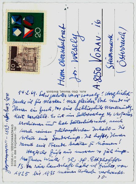 1 S. (Qu.-)8vo. Mit eh. Adresse. An Josef Wesely: "[…] Mit gleicher Post sende ich Ihnen ein Buch, das eine bibliophile Merkwürdigkeit darstellt. Es ist im Selbstverlag des Verfassers erschienen und hat Seltenheitswert, auch durch seinen philosophischen Inhalt - die Arbeit eines Sonderlings […]". - Ettighofer hatte in den dreißiger Jahren zahlreiche als Tatsachenbrichte deklarierte Kriegsbücher und Reiseschilderungen sowie Sachbücher über Afrika verfaßt, die deutlich antisemitische Wendungen und nationalsozialistische Bekenntnisse enthielten. Während des Krieges bei einer Propagandaeinheit in Finnland und Frankreich, wurde er 1946 aus englischer Kriegsgefangenschaft entlassen, konnte aber an seine alten Erfolge nicht mehr anschließen. Seit 1949 arbeitete er bei der "Kölner Rundschau" und schrieb Romane sowie Sachbücher.