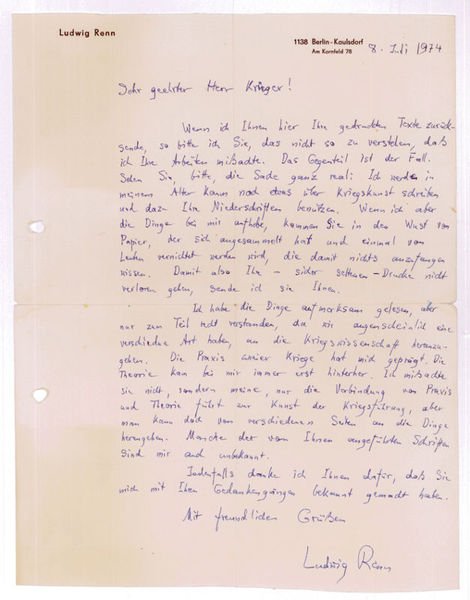 1 S. 4to. Gedr. Briefkopf. Gelocht. An Wolfgang Krüger in Berlin, dem er seine Manuskripte zurückschickt: "[…] Wenn ich Ihnen hier Ihre Texte zurücksende, so bitte ich Sie, das nicht so zu verstehen, daß ich Ihre Arbeiten mißachte. Das Gegenteil ist der Fall. Sehen Sie, bitte, die Sache ganz real: Ich werde in meinem Alter kaum noch etwas über Kriegskunst schreiben und dazu Ihre Niederschriften benutzen. Wenn ich aber die Dinge bei mir aufhebe, kommen Sie in den Wust von Papier, der sich angesammelt hat und einmal von Leuten vernichtet werden wird, die damit nichts anzufangen wissen. Damit also Ihre - sicher seltenen - Drucke nicht verloren gehen, sende ich sie Ihnen. Ich habe Ihre Dinge aufmerksam gelesen, aber nur zum Teil recht verstanden, da wir augenscheinlich eine verschiedene Art haben, an die Kriegswissenschaft heranzugehen. Die Praxis zweier Kriege hat mich geprägt. Die Theorie kam bei mir immer erst hinterher. Ich mißachte sie nicht, sondern meine, nur die Verbindung von Praxis und Theorie führt zur Kunst der Kriegsführung […]" - Kommunistische Lektüre und das Miterleben der polizeilichen Gewalt gegen demonstrierende Arbeiter in Wien wurden Ausgangspunkt für Renns politisches Handeln, als er 1927 nach Deutschland zurückkehrte, hält er unter dem Namen Ludwig Renn Vorträge für Arbeiter. 1928 erschien sein Roman "Krieg", in dem der Krieg aus der Sicht des fiktiven Landsers Ludwig Renn beschrieben wurde. 1928-32 war Renn Mitherausgeber der Zeitschriften "Aufbruch" und "Die Linkskurve". 1930 beschrieb er in seinem zweiten Roman "Nachkrieg" die innenpolitischen Kämpfe von der Revolution 1918/19 bis zum Kapp-Lüttwitz-Putsch. Während der Jahre 1932 und 1935 kam Renn immer wieder in Haft, unter anderem wegen "literarischen Hochverrats" und "Vorbereitung zum Hochverrat", 1936 gelang ihm die Flucht nach Spanien, wo er im Spanischen Bürgerkrieg aktiv wurde. 1940 emigrierte er nach Mexiko. 1947 nach Deutschland zurückgekehrt, wurde Renn Mitglied der SED. 1951 wechselt er an die Berliner Humboldt-Universität.