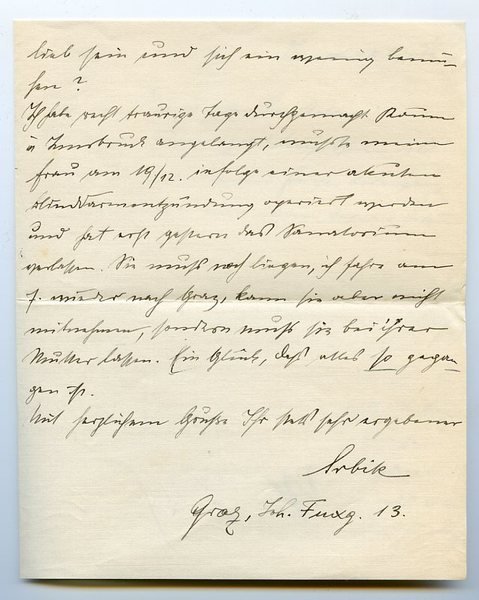 3 SS. auf Doppelblatt. Gr.-8vo. An den namentlich nicht genannten Psychologen Hermann Swoboda (1873-1963), den Begründer der "Periodenlehre" des Biorhythmus, mit der Bitte um die Empfehlung eines Nachhilfelehrers für einen "sehr begabten, aber schwerfälligen Mann", der die Rigorosen an der Universität Wien abzulegen gedenkt: "[.] Er hat als Studiengebiet für das Rigorosum die Geschichte der neuern deutschen, englischen u. französischen Philosophie bis etwa Kant gewählt. Die Lehrbücher genügen ihm nicht d. h. er sagt, er könne aus ihnen nicht ganz klug werden und möchte einige Tage vor dem Rigorosum in Wien bei einem guten Kenner der Materie einige Informationsstunden nehmen [.]". - Der große Historiker war Professor für Geschichte in Graz und Wien. Sein 1925 erschienener "Metternich, der Staatsmann und der Mensch" gab Anstoß zu einer Neubewertung der Geschichte des Vormärz und brachte ihm Anerkennung als einer der führenden deutschen Historiker. 1929/30 als Unterrichtsminister im Kabinett Schober tätig, lehnte er eine spätere Einladung von Bundeskanzler Schuschnigg, in dessen Regierung einzutreten, ebenso ab wie Berufungen an die Universitäten Bonn, Köln, Berlin und München. 1938 wurde Srbik als Vertreter der österreichischen Wissenschaft im Deutschen Reichstag nominiert, ohne vorher der NSDAP angehört zu haben. Im "Anschluß" Österreichs sah er seine Reichsidee zwar verwirklicht, trat aber als Präsident der Akademie der Wissenschaften in Wien für die Bewahrung österreichischer Traditionen ein. Wegen seiner Zugehörigkeit zum Deutschen Reichstag wurde er nach Kriegsende von seinem Lehrstuhl und seinen anderen akademischen Funktionen entbunden und vorübergehend in Ehrwald (Tirol) inhaftiert. Vgl. Öst. Lex. II, 426.