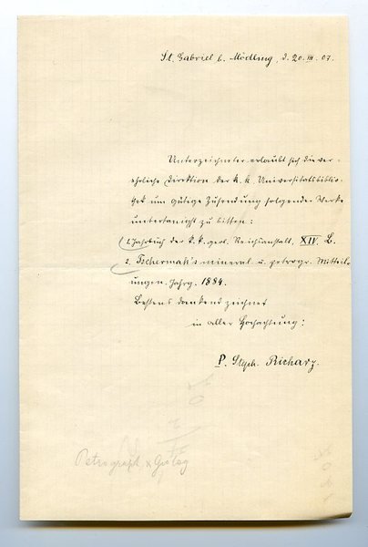 ½ S. auf Doppelblatt. Gr.-8vo. An die Universitätsbibliothek Wien betr. der Entlehnung des XIV. Bandes des Jahrbuchs der k. k. geol. Reichsanstalt sowie von Tschermaks Mineralogischen und geologischen Mitteilungen. - Richarz studierte nach seiner Priesterweihe 1901 Geologie, Paläontologie, Petrographie und Chemie, wurde 1919 promoviert und lehrte als Professor der Geologie und Astronomie an der Missionsanstalt St. Gabriel. 1921 ging er als Professor der Geologie an das St. Mary’s College in Techny (USA) und 1931 nach Peking, wo die Steyler Missionare die katholische Universität übernahmen und er Vorlesungen über Geologie, Petrographie und Mineralogie hielt. - Mit zeitgenöss. Bearbeitungsvermerk.