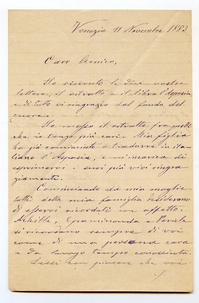 Large 8vo. 1½ p. on bifolium. An den Linguisten Gustav Meyer (1850-1900), Professor der Universität Graz, mit Dank für verschiedene Zusendungen und einer herzlichen Einladung nach Venedig, wo Meyer offenbar längere Zeit im Haus der Familie verbracht hatte: "Caro amico, ho ricevuto due vostre lettere, il ritratto e il libro 'L'Aspasia' e di tutto vi ringrazio dal fondo del cuore. Ho messo il ritratto fra quelli che ritengo più cari. Mia figlia ha già cominciato a tradurre in italiano 'L'Aspasia' e m'incarica di esprimervi i suoi più vivi ringraziamenti. Cominciando da mia moglie tutti della mia famiglia desiderano d'esservi ricordati con affetto. Achille, Epaminonda e Pericle si ricordano sempre di voi come di una persona cara e da lungo tempo conosciuta. Lessi con piacere che voi non vi siete trovato male in casa nostra, ciò mi fa sperare che presto ci procurerete il piacere di godere della vostra cara compagnia. La vostra cameretta è sempre a vostra disposizione. Statemi bene e ricordatevi sempre de' vostri amici di Venezia [.]". - Bei dem Buch dessen Übersetzung ins Italienische Triantafillis Tochter "schon begonnen" hat, dürfte es sich um Robert Hamerlings 1876 erschienen historischen Roman Aspasia handeln. - Altersbedingt gebräunt. - Aus der Sammlung von Eduard Fischer von Röslerstamm (1848-1915).