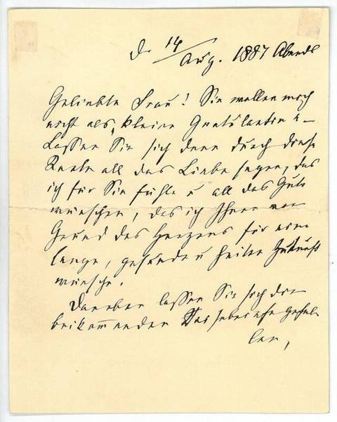 114:89 mm. An eine namentlich nicht genannte Adressatin: "Sie wollen mich nicht als ‚kleine Gratulantin' - Lassen Sie sich denn durch diese Karte all das Liebe sagen, das ich für Sie fühle u. all das Gute wünschen, das ich Ihnen von Grund des Herzens für eine lange, gesunde u. heitre Zukunft wünsche […]". - Geboren als Tochter eines Kaufmanns, trat Fanny Lewald 1828 zusammen mit ihrer Familie zum Protestantismus über, erhielt eine außergewöhnlich gute Ausbildung, übersiedelte 1843 nach Berlin und verkehrte u. a. mit Henriette Herz, Heinrich Laube und Therese von Bacheracht. Ihre ersten Romane (darunter "Clementine", 1824) konnte sie mit Hilfe ihres Vetters August anonym bei Brockhaus in Leipzig herausbringen. "Sie gehörte zu den ersten erfolgreichen deutschen Berufsschriftstellerinnen [und] widmete sich in ihren Romanen und publizistischen Gelegenheitsschriften aktuellen Themen, vor allem der Frauenemanzipation (u. a. 'Osterbriefe für die Frauen', 1863; 'Für und Wider die Frauen', 1870)" (DBE). 1854 ehelichte die Schriftstellerin den Schriftsteller und Literarhistoriker Adolf Stahr.