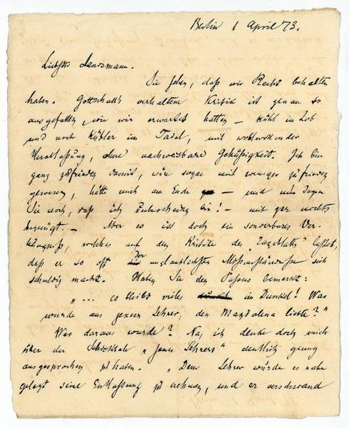 5 SS. 4to. An seinen "Landsmann" Reusche, bezüglich einer Kritik seines Stückes "Maria und Magdalena" (Schauspiel in 4 Akten): "Sie sehen, dass wir Recht behalten haben. Gottschalls verhaltene Kritik ist genau so ausgefallen wie wir erwartet hatten - kühl in Lob und noch kühler im Tadel, mit wohlwollender Handfassung, ohne nachweisbare Gehässigkeit. Ich bin ganz zufrieden damit, wäre sogar mit weniger zufrieden gewesen, hätte mich am Ende - und nun sagen Sie noch, dass ich unbescheiden bin! - mit gar nichts begnügt. Aber es ist doch ein sonderbares Verhängnis, welches auf dem Kritiker des ‚Tageblatts' lastet, dass er so oft der unglaublichsten Missverständnisse sich schuldig macht. Haben Sie den Passus bemerkt: ‚… es bleibt vieles im Dunkel! Was wurde aus jenem Lehrer, den Magdalena liebte?' Was daraus wurde? Na, ich denke doch mich über das Schicksal ‚jenes Lehrers' deutlich genug ausgesprochen zu haben. ‚Dem Lehrer wurde es nahe gelegt seine Entlassung zu nehmen, und er verschwand ohne Aufsehen', sagt Magdalena zu Laurentius […]". Es folgt eine lange Besprechung der Rolle in seinem Stück. "Nun, ernst gesprochen frage ich Sie: ist es erhört, dass Gottschall von alledem nichts, aber auch gar nichts gemerkt hat und ganz unbefangen fragt, was aus ‚jenem Lehrer' geworden ist?!? Wenn er - und das halte ich nach seiner Frage für zweifellos - nicht herausgefunden hat, das ‚jener Lehrer' und Dr. Gels von Gelzinnen identisch sind, dann hat er das ganze Stück einfach nicht verstanden, dann nimmt er der ohnehin schon schwächlichen Handlung die wirksamste Triebfeder, dann hat er mich viel zu milde beurtheilt, weil dann die ganze Geschichte sinnlos ist. Ich stehe da vor einem Räthsel, und könnte ich's lösen, ich gäb' was drum […]". - Gefaltet.