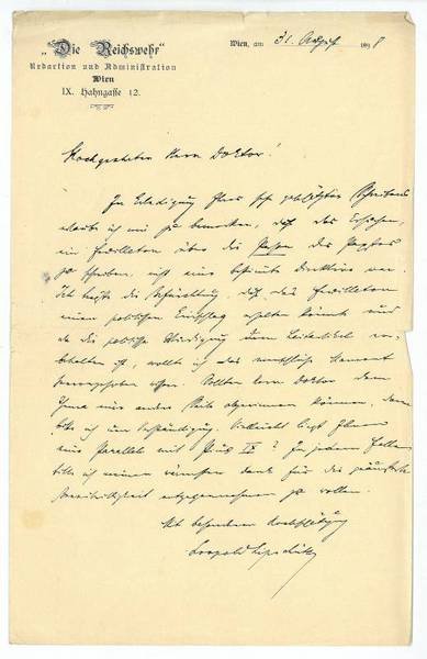 1 S. 8vo. In Erledigung Ihres sehr geschätzten Schreibens erlaube ich mir zu bemerken, dass das Ersuchen ein Feuilleton über die Person des Papstes zu schreiben, nicht eine bestimmte Direktive war. Ich hegte die Befürchtung, dass das Feuilleton einen politischen Einschlag erhalten könnte und da die politische Würdigung dem Leitartikel vorbehalten ist, wollte ich das menschliche Moment hervorgeschoben wissen […]. - Auf gefalt. Briefpapier mit gedr. Briefkopf der "Reichswehr". - "Lipschütz trat 1892 in die Redaktion der "Presse", später der "Reichswehr" ein, wurde vom Herausgeber als Redakteur in den Mitarbeiterstab der "Österreichischen Kronenzeitung" übernommen und war als deren Chefredakteur und Miteigentümer wesentlich am Aufstieg des Blatts beteiligt. Mit seiner Frau floh er 1938 vor den einmarschierenden nationalsozialistischen Truppen nach Frankreich, wo beide Selbstmord begingen" (DBE).