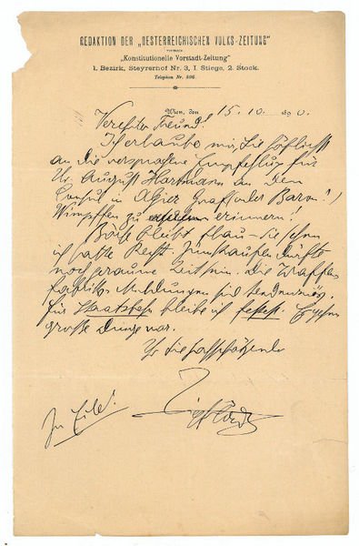 1 S. Gr.-8vo. Mit eh. adr. Kuvert. An den Musiker und Wienerlied-Komponisten Gustav Pick (1832-1921): "Ich erlaube mir, Sie höflichst an die versprochene Empfehlung für Hr. August Hartmann an den Consul in Algier Graf (oder Baron!) Wimpffen zu erinnern! Börse bleibt flau - Sie sehen ich hatte Recht [.]". - Siegfried Löwy war Mitarbeiter der "Morgen-Post" und Korrespondent des "Berliner Börsen-Couriers" sowie der "Frankfurter Nachrichten". Mit der Gründung der "Oesterreichischen Volks-Zeitung" 1888 übernahm Löwy die Leitung des Wirtschaftsteils, begann aber sich vermehrt für Theater und Lokalgeschichte zu interessieren und publizierte darüber im "Neuen Wiener Journal", dem "Neuen Wiener Tagblatt", in der "Neuen Freie Presse", der "Österreichischen Rundschau" u. a. Engere Freundschaft verband ihn mit Alexander Girardi und Johann Strauss (Sohn), und auch unterstützte er Felix Salten bei der Gründung des ersten österreichischen Kabaretts "Jung-Wiener Theater zum lieben Augustin" und setzte sich für die Errichtung der Denkmäler in Wien für Ferdinand Raimund (1898), Josef Kainz (1911), Alexander Girardi (1929) und für das Johann-Strauß-Denkmal (1921) ein. - Auf Briefpapier mit gedr. Briefkopf; mit kleinen Randaus- und -einrissen bzw. -läsuren.