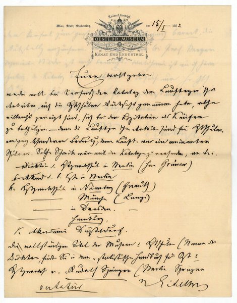 1½ SS. auf Doppelblatt. Gr.-4to. An einen namentlich nicht genannten Adressaten: "Euer Wohlgeboren werden wohl bei Versand der Kataloge der Laufberger'schen Arbeiten auf die K[un]stschulen Rücksicht genommen haben, welche vielleicht geneigt sind, sich bei der Lizitation als Käufer zu bethätigen. - Denn die Laufbergerschen Aerbeiten sind für K[un]stschulen von ganz besonderer Bedeutung; denn Laufb. war ein eminenter Schulmann [.]". - Eitelberger-Edelberg, dessen Name bis heute mit dem Aufschwung der Wiener Schule der Kunstgeschichte verbunden ist, leitete als Direktor das von ihm 1864 initiierte Österreichische Museum für Kunst und Industrie (heute Museum für angewandte Kunst), reorganisierte 1872 die Akademie der bildenden Künste und gab Anregungen zur Gründung der "Zentralkommission für Kunst und historische Denkmale". - Auf Briefpapier mit gedr. Briefkopf des Österreichischen Museums für Kunst und Industrie.