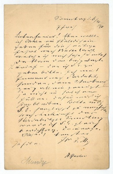 1 S. auf Doppelblatt. 8vo. An einen namentlich nicht genannten Adressaten: "Eben wollte ich Ihnen ein Stelldichein geben für die heutige Fahrt nach Baden (auf welche ich mich sehr freute) da kam der [hier nicht mehr] beiliegende Brief - den ich S. E. zu geben bitte. Ich muß Jemand nach Pardubitz senden [.]". - Jaromir Frh. von Mundy war neben Theodor Billroth Gründer des Wiener Rudolfinerhauses. "Als Mundys größte Leistung gilt die auf seine Anregung hin von Hans Wilczek und Eduard Lamezan 1881 gegründete Wiener freiwillige Rettungsgesellschaft, durch die er zum Begründer des modernen Rettungswesens wurde" (DBE). - Mit stärkeren Läsuren am rechten Rand und gepr. Vignette.