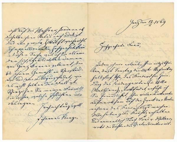4 SS. auf Doppelblatt. Gr.-8vo. An eine Dame: "Indem ich mir erlaube Ihnen mitzutheilen, daß Samstag den 20ten Nachmittag halb fünf Uhr das Koncert für Gründung des Kindergartens (in Villa Mauthner) stattfindet, ersuche ich Sie freundlichst, Ihre vielen Bekannten aufmerksam auf den Zweck der Unternehmer des Koncerts zu machen. Wir haben gute Kräfte erhalten und namentlich durch Frau v. Wallner wirkt die Tochter des Theaterdirektor[s] mit [.]". - 1843 wegen eines im 'Sächsischen Vaterlandsblatt' veröffentlichten Angriffs auf das Breslauer Domkapitel von seinem Amt als Kaplan suspendiert, lehnte Ronge eine Aussöhnung mit der Kirche ab. 1844 wandte er sich in einem offenen Brief an den Bischof von Trier gegen die Ausstellung der berühmten Reliquie des Hl. Rocks - den zu sehen über eine Million Pilger aus Deutschland, Luxemburg und Belgien kamen -, wurde daraufhin exkommuniziert und begründete 1845 in Breslau die Allgemeine christliche Gemeinde (später Deutsch-katholische Kirche).