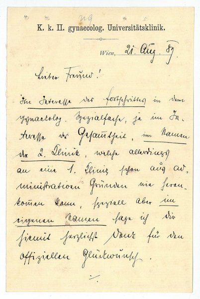 2 SS. 8vo. An einen namentlich nicht genannten Adressaten: "Im Interesse des Fortschrittes in dem gynaekolog. Spezialfache, ja im Interesse der Gesamtheit, im Namen der 2. Klinik, welche allerdings an eine 1. Klinik schon aus administrativen Gründen nie herankommen kann, speziell aber im eigenen Namen sage ich Dir hiemit herzlichsten Dank für den officiellen Glückwunsch [.]". - Alfons von Rosthorn war chirurgischer Operationszögling unter Theodor Billroth, habilitierte sich 1891 für Gynäkologie und Geburtshilfe und erhielt 1892 eine a.o. Professur, 1894 eine o.Professur für Geburtshilfe und Gynäkologie an der Deutschen Universität Prag. Später war er in Graz, Heidelberg und seit 1908 in Wien tätig, wo er die II. Universitäts-Frauenklinik leitete. Seine Arbeitsschwerpunkte waren die entzündlichen Erkrankungen der Eileiter und Eierstöcke sowie die Anatomie des Beckenbindegewebes. - Auf Briefpapier mit gedr. Briefkopf der II. Gynäkologischen Univ.-Klinik; kleine Stecknadeldurchstiche am oberen Rand.