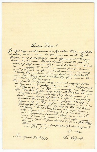 1 S. 8vo. An einen Herrn Born: "heutzutage muß man verschiedene Nebengeschäfte treiben, wenn man zurechtkommen will. Ich beschäftige mich hauptsächlich mit Ehevermittlungen unter der Firma ‚Onkel Jonas' und Sie standen natürlich auf meiner Liste mit 2 Sternen. Ich habe immer gehofft, Sie würden einmal hierherkommen und ich könnte an Ihnen etwas verdienen (ich mache es billig, 5 % von beiden Seiten) und nun spielen Sie mir diesen Strich und verloben sich ohne meine Vermittlung! […]". - Weigert förderte durch neuartige Färbemethoden (besonders mit Anilinfarben) die normale und pathologische Histologie, insbesondere des Zentralnervensystems, und die Bakteriologie und legte damit den Grundstein für spätere Arbeiten, u.a. von Paul Ehrlich und Robert Koch.
