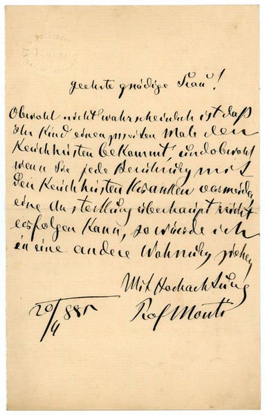 1 S. 8vo. Mit eh. adr. Kuvert. An eine Dame: "Obwohl nicht wahrscheinlich ist daß Ihr Kind einen [!] zweiten Male den Keuchhusten bekommt, und obwohl wenn Sie jede Berührung mit den Keuchhusten Kranken vermeiden, eine Ansteckung überhaupt nicht erfolgen kann, so würde ich in eine andere Wohnung ziehen [.]". - Alois Monti war seit 1872 Vorstand der 2. Abteilung für Kinderheilkunde an der Wr. Allgemeinen Poliklinik und übernahm 1893 auch die Direktion des Hauses. "Monti war Mitbegründer und Direktor des 1887 gegründeten Vereins zur Errichtung und Förderung von Seehospizen und Asylen für Kranke, besonders für skrofulöse und rachitische Kinder [.] Monti ist nicht nur durch seine Verdienste um die Gründung und den Ausbau der Wr. Allg. Poliklinik, für die er auch eigene Mittel zur Verfügung stellte, von Bedeutung sondern auch durch die von ihm augurierte Dauerbehandlung der Tuberkulose [.]" (ÖBL VI, 362). - Auf Briefpapier mit gepr. Briefkopf.