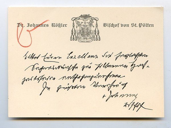 1 S. Qu.-8vo. Mit einer Beilage (s. u.). Dr Johannes Rößler, Bischof von St. Pölten "bittet Euere Excellenz die herzlichsten Segenswünsche zur silbernen Hochzeitsfeier entgegenzunehmen [.]". - J. B. Rössler war seit 1894 Bischof von St. Pölten und wurde 1899 Päpstlicher Thronassistent, 1908 dann Geheimer Rat. - Auf Briefpapier mit gedr. Briefkopf und mit zeitgenöss. Registraturvermerk in rotem Farbstift; beiliegend eine Visitenkarte von P. Bonifaz Maria Ecker, dem Abt der Olivetaner-Benediktiner Abtei St. Joseph auf Tanzenberg - Maria Saal.