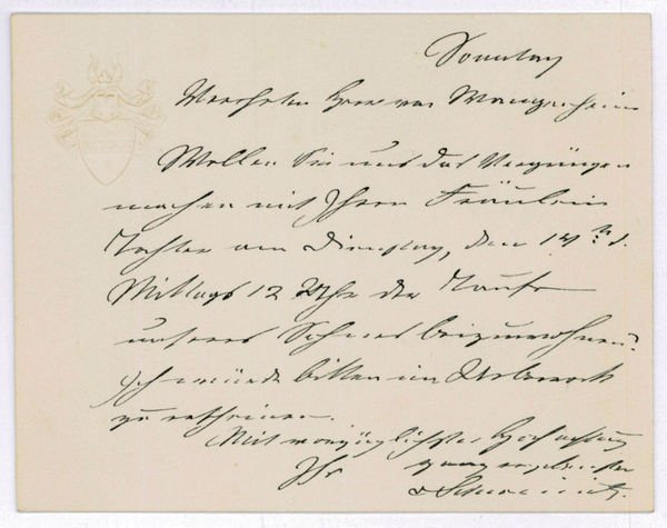1 S. Qu.-kl.-8vo. Mit eh. adr. Kuvert. An Frh. von Wangenheim: "Wollen Sie uns das Vergnügen machen mit Ihrem Fräulein Tochter am Dienstag [.] der Taufe unseres Sohnes beizuwohnen? [.]". - Hans von Schweinitz war seit 1857 persönlicher Adjutant des Prinzen Friedrich Wilhelm von Preußen; 1861 als Militärattaché nach Wien entsandt und 1865 als Militärbevollmächtigter in St. Petersburg tätig, war er später Gesandter des Norddeutschen Bundes und Botschafter des Deutschen Reiches in Wien, wo er sich um die Wiederannäherung Deutschlands und Österreichs Verdienste erwarb. - Auf Briefpapier mit gepr. Vignette.