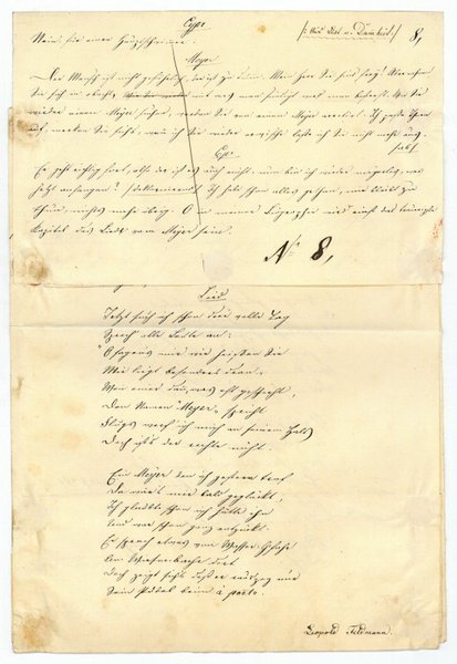 4 SS. auf Doppelblatt. Folio. Aus "List und Dummheit": "[.] Lied | Jetzt such ich schon drei volle Tag | Sprech' alle Leute an: | 'O sagen's mir wie heißen Sie | Mir liegt besonders dran'. | Wenn einer dann, was oft geschieht, | Den Namen 'Meyer' spricht | Flugs werf' ich mich an seinen Hals | Doch ist's der rechte nicht [.]". - Leopold Feldmann "brach erst eine Schuhmacher-, dann eine Sattlerlehre ab und arbeitete als kaufmännischer Angestellter in Pappenheim, seit 1821 in einer Münchner Bijouteriehandlung. Hier begann er, für verschiedene Zeitungen Humoresken sowie satirische Genrebilder zu schreiben, und war schließlich mit wachsendem Erfolg als freier Schriftsteller tätig" (DBE). 1848 wurde er Mitglied des Prüfungskomitees des Münchner Hoftheaters und übersiedelte 1850 als Dramaturg des Nationaltheaters nach Wien. Vgl. auch Kosch I, 497. - Mit einigen alt montierten Textbausteinen und entsprechenden Klebespuren.