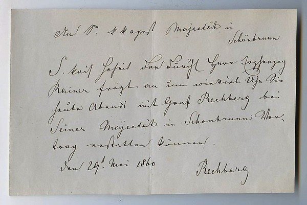 1 S. Qu.-gr.-8vo. An S. k k apost. Majestät in Schönbrunn: "S. kais. Hoheit der durchl. Herr Erzherzog Rainer frägt an um wie viel Uhr Sie heute Abends mit Graf Rechberg bei Seiner Majestät in Schönbrunn Vortrag erstatten können [.]". - Seit 1829 als Gesandter im auswärtigen Dienst tätig, kehrte Johann Gf. von Rechberg und Rothenlöwen 1847 nach Österreich zurück und begleitete im Jahr darauf Staatskanzler Metternich auf seiner Flucht bis Den Haag. Später Präsidialgesandter beim Deutschen Bundestag und Minister des kaiserlichen Hauses und des Äußeren, war er bis zur Bildung des Kabinetts Schmerling zugleich Ministerpräsident. Für eine Zusammenarbeit mit Preußen und Rußland eintretend, konnte er sich aber in der schleswig-holsteinischen und der Zollvereinsfrage weder gegen Bismarck noch gegen die Preußengegner unter seinen Ministerkollegen durchsetzen und legte nach dem Scheitern der Zollvereinverhandlungen 1864 sein Amt nieder; bis zu seinem Tod lebte der Träger der Ordens vom Goldenen Vlies auf Schloß Kettenhof bei Wien.