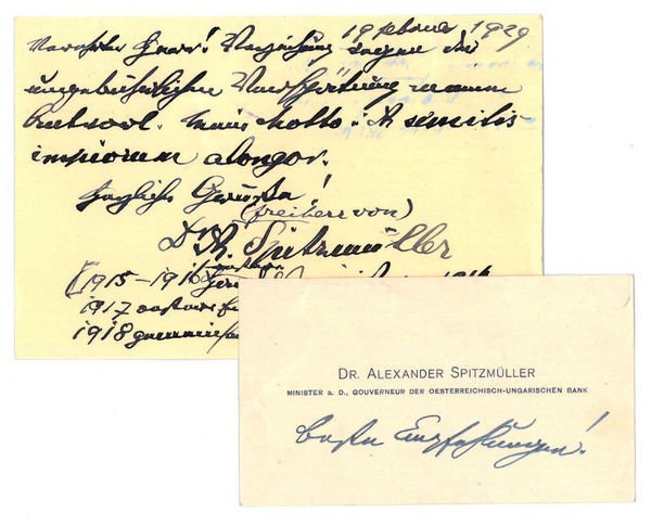 1 S. Qu.-8vo. Beiliegend eine Visitenkarte mit "besten Empfehlungen". An einen namentlich nicht genannten Adressaten: "Verzeihung wegen der ungebührlichen Verspätung meiner Antwort. Mein Motto: 'A semitis impiorum alongor" | Herzliche Grüße! | Dr. A. Spitzmüller". - Alexander Frh. von Spitzmüller war von 1904 bis 10 Präsident der Finanzlandesdirektion, hernach Handelsminister und Generaldirektor der Österreichischen Creditanstalt, wurde 1916 mit der Kabinettsbildung betraut und leitete 1916/17 und 1918 das Finanzministerium. Nach dem Ersten Weltkrieg war er Gouverneur der Österreichisch-ungarischen Bank und zu Beginn der 1930er Jahre erneut Direktor der Creditanstalt.