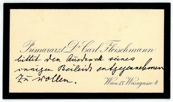 1 S. Visitkartenformat. Bittet den Ausdruck eines innigen Beileids entgegennehmen zu wollen. - Carl Fleischmann studierte an der Prager Deutschen Univ. Medizin und wurde 1882 promoviert, war dann vier Jahre Assistent August Breiskys an der Prager Universitäts-Frauenklinik und ließ sich 1887 als Facharzt für Geburtshilfe und Gynäkologie in Wien nieder. "1902 kam er als Primararzt an die Gynäkologische Abteilung des Wiener Rothschildspitals, das er 1910-24 leitete. Fleischmann, der als Jude 1938 nach London emigrierte, veröffentlichte zahlreiche Arbeiten auf dem Gebiet der Gynäkologie und Geburtshilfe" (DBE). - Mit schwarzem Trauerrand.