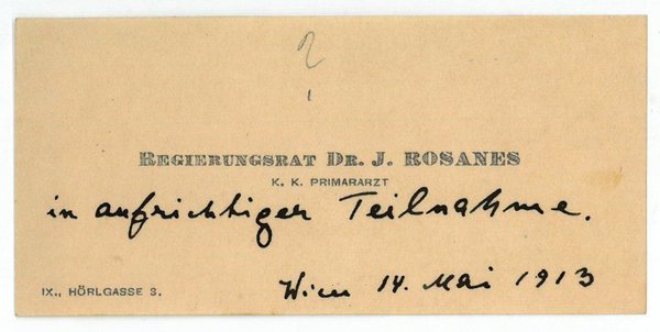 1 S. Visitkartenformat. An einen namentlich nicht genannten Adressaten "in aufrichtiger Teilnahme". - Ignaz Rosanes war Direktor des Kronprinzessin Stephanie-Spitals und war später als Konsiliararzt für Urologie und Chirurgie am Rothschildspital tätig.