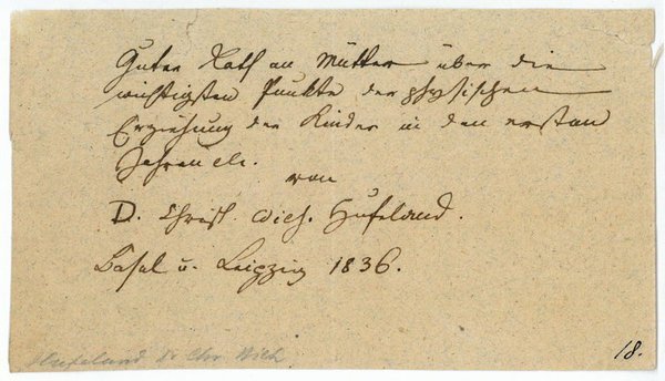 1 S. Qu.-8vo. Titel seines 1799 erschienenen Werkes "Guter Rath an Mütter über die wichtigsten Punkte der physischen Erziehung der Kinder in den ersten Jahren etc. […]". - Hufeland war 1810 an der Gründung der Berliner Universität beteiligt und übernahm als erster das Dekanat der Medizinischen Fakultät. Er hatte den Lehrstuhl für spezielle Pathologie und Therapie inne und richtete 1810 für den praktischen ärztlichen Unterricht eine Poliklinik für unbemittelte Kranke in Berlin ein. Hufeland wurde Staatsrat, wirkte in der Armendirektion mit, verfasste eine Armen-Pharmakopoe und gründete eine Medicinisch-chirurgische Gesellschaft (seit 1833 "Hufelandsche Gesellschaft").