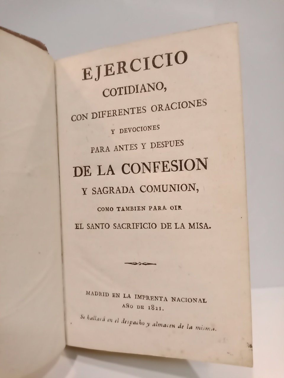 Ejercicio cotidiano, con diferentes oraciones y devociones para antes y despues de la Confesión y Sagrada Comunión, como tambien para oir el Santo Sacrificio de la Misa | Libri antichi e moderni | Ejercicio.