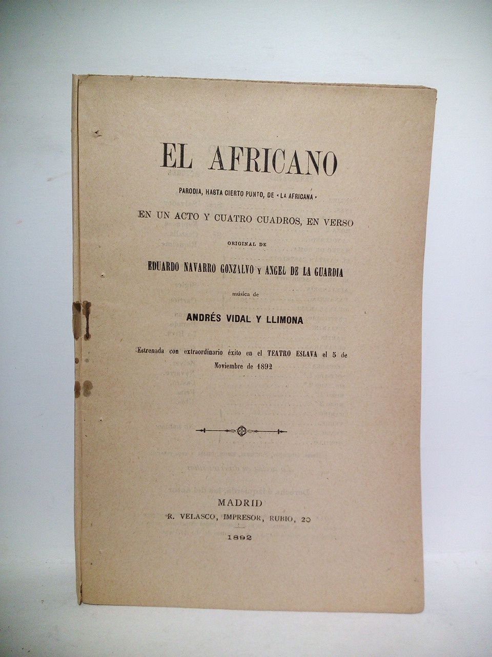 El africano. (Parodia, hasta cierto punto, de "La Africana", en un acto y cuatro cuadros, en verso. Estrenada con extraordinario éxito en el Teatro Eslava el 5 de Noviembre de 1892) / Música de Andres Vidal y Llimona | Libri antichi e moderni | Navarro Gonzalvo, Eduardo Y Angel De Laguardia