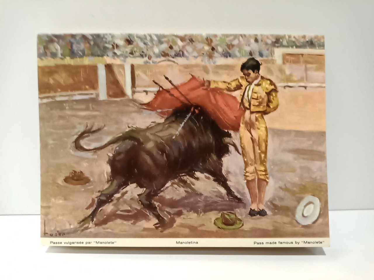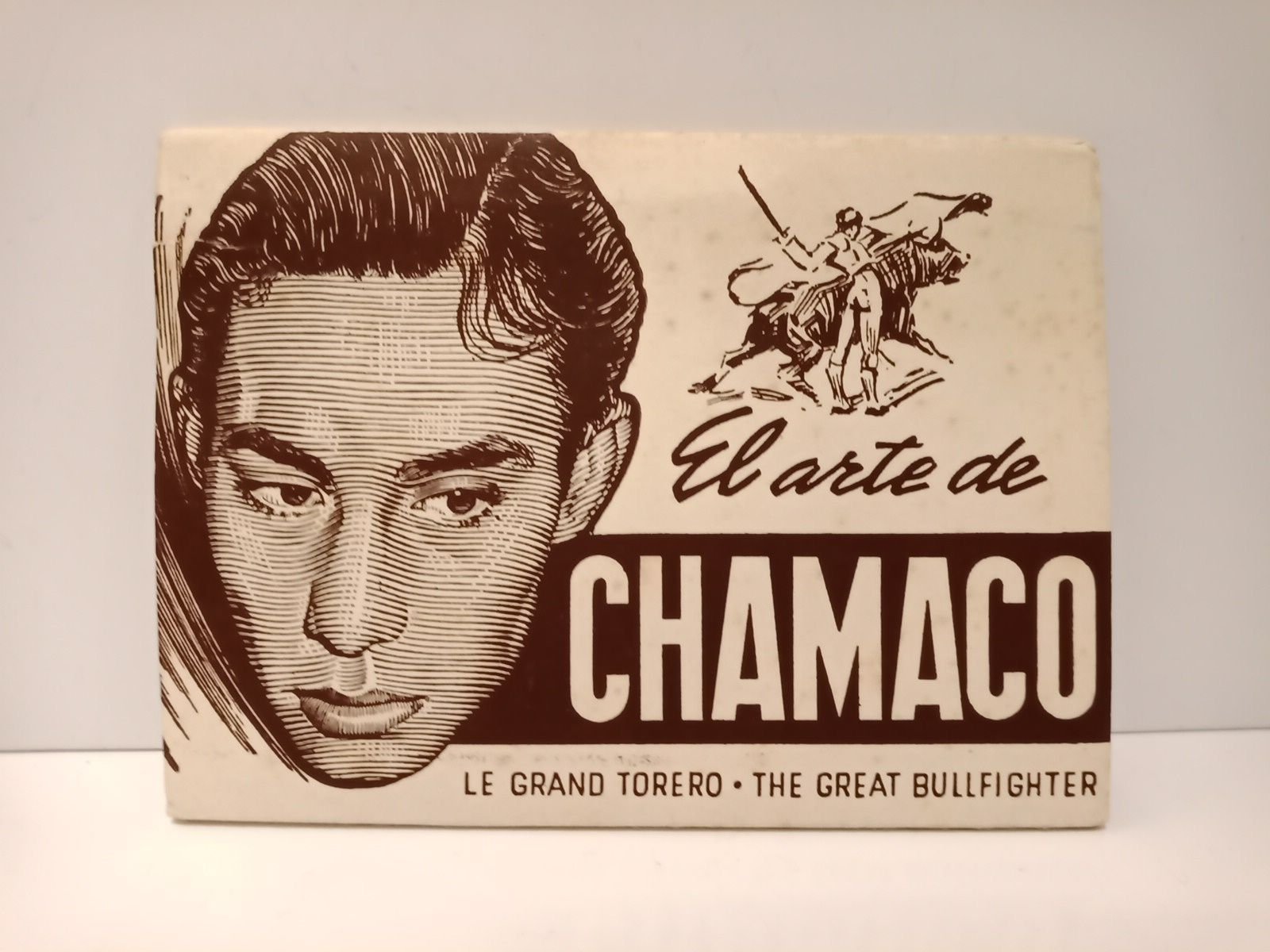 Barcelona: Ed. Artigas, [ca. 1950].- Colección de nueve postales oleográficas desplegables; 8º minúsculo apaisado (10,8 x 14,7 cm); Estuche Ed. en cartulina ilustrada.* Pequeño desgarro en el margen exterior izquierdo de la cubierta anterior. TAUROMAQUIA