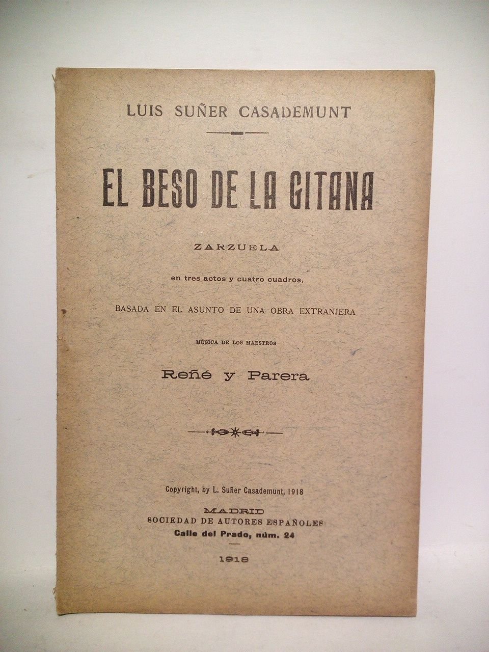 El beso de la gitana. (Zarzuela en ntres actos y cuatro cuadros basada en el asunto de una obra extranjera. Estrenada en el Teatro Español la noche del 20 de Abril de 1918) / Música de los maestros Reñé y Parera | Libri antichi e moderni | Suñer Casademunt, Luis