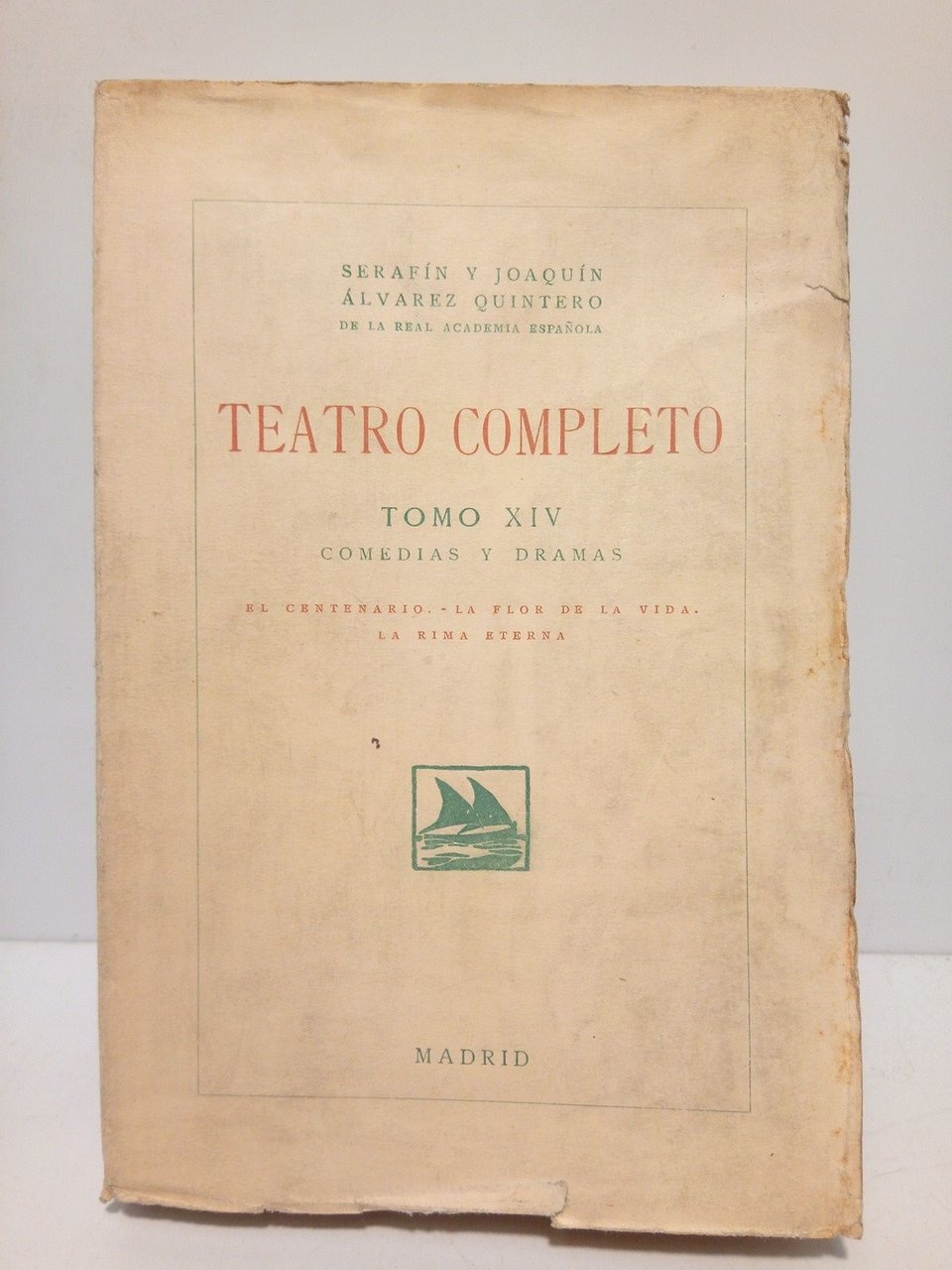 Madrid: Sociedad General Española de Librería (Imp. Clásica Española), 1926.- 278 p., [5 h.]; 8º mayor (19,2 x 13 cm); Intonso, sin desbarbar, con todos sus margenes; Rústica Ed.- (TEATRO COMPLETO. Tomo xiv. Comedias y Dramas).* Cubiertas fatigadas, especialmente la posterior y algunas hojas (muy pocas) con unas pocas motas de óxido. TEATRO ESPAÑOL DE LOS SIGLOS XIX-XXI