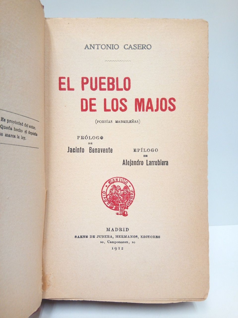 El Pueblo de los Majos (Poesías madrileñas) / Prólogo de Jacinto Benavente; Epílogo de Alejandro Larrubiera | Libri antichi e moderni | Casero, Antonio