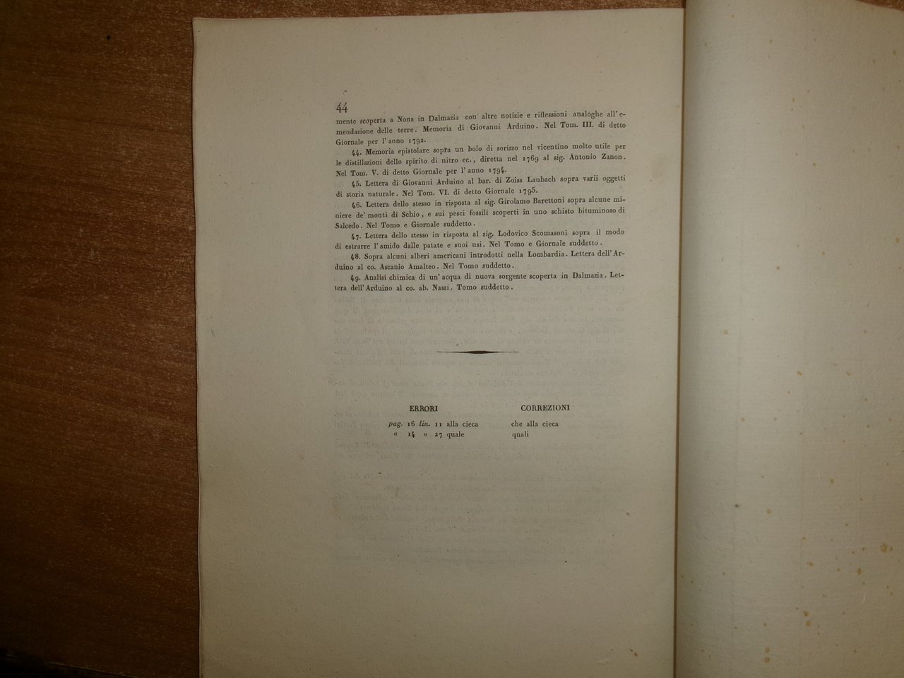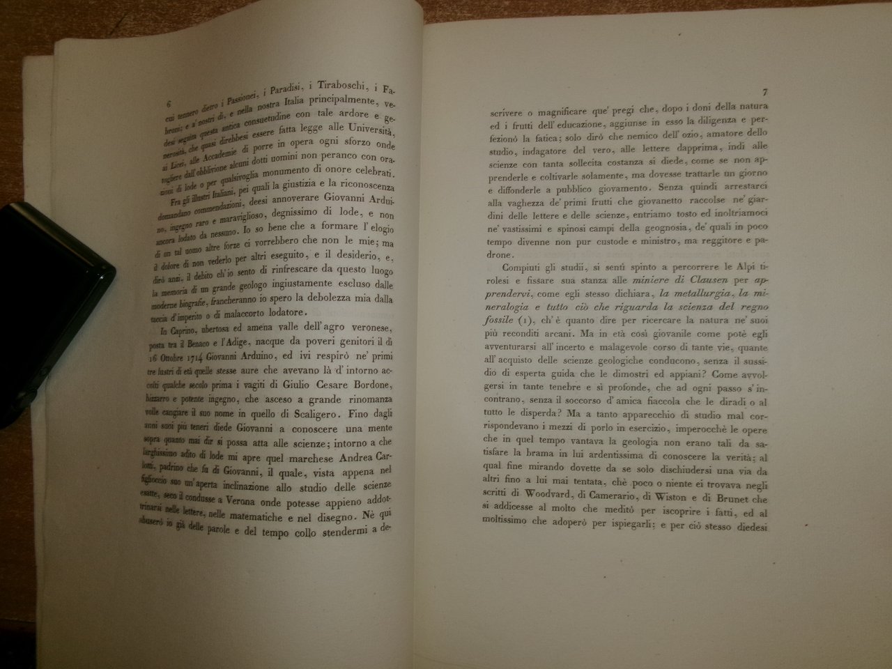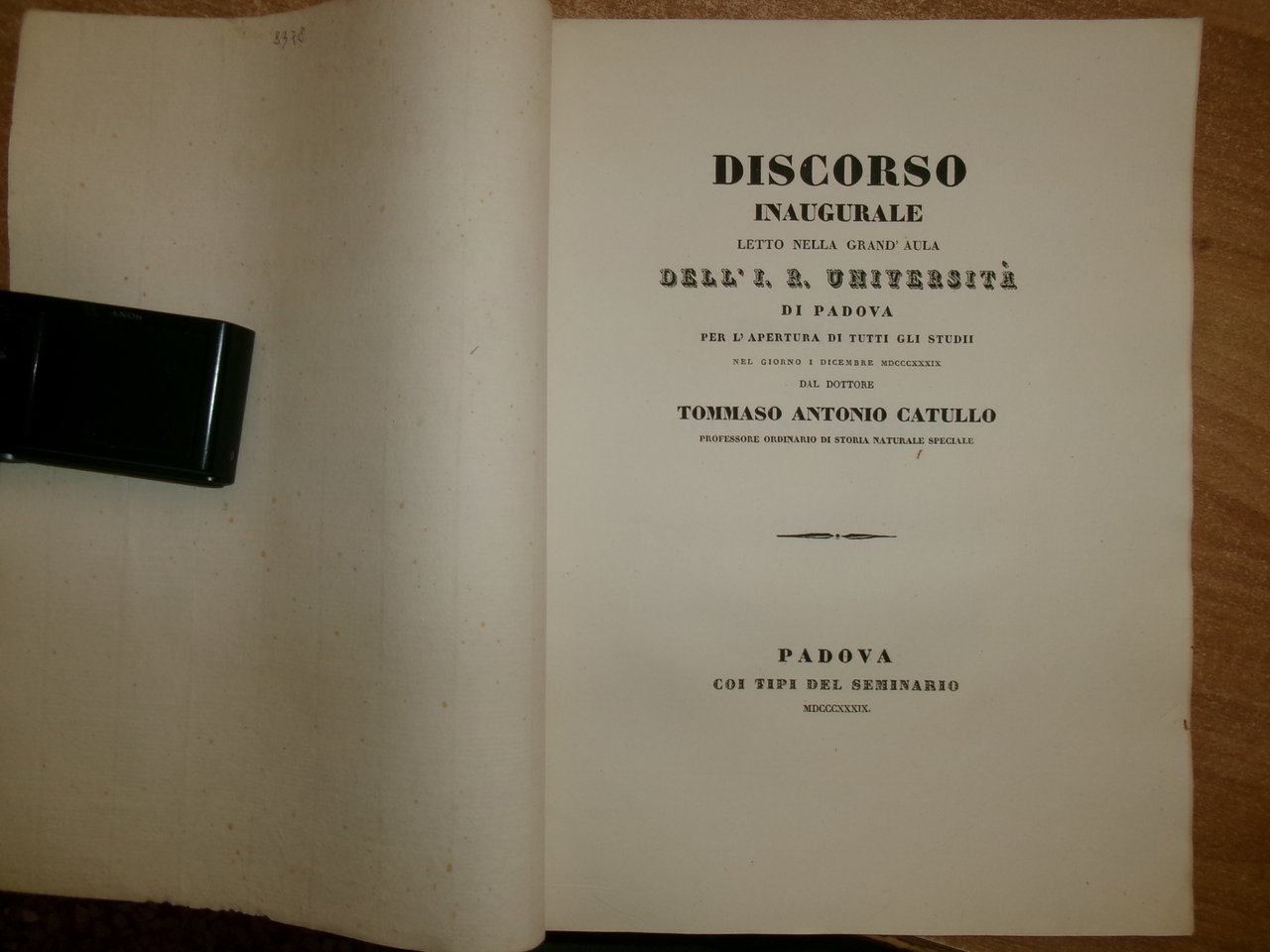 ELOGIO di GIOVANNI ARDUINO. Discorso inaugurale letto nella Grand' Aula dell' I.R. Università di Padova per l' apertura di tutti gli studi nel giorno 1 Dicembre MDCCCXXXIX dal Dottore Tommaso Antonio Catullo Professore Ordinario di Storia Naturale. Padova, Coi Tipi bdel Seminario, 1839. In-4°, br. 44 pp. Ottimo stato. Neg. mob. F entro busta trasp.