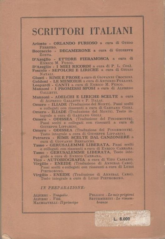Copertina: flessibile, ingiallita con lievi segni d'uso, con strappo e adesivo in quarta di copertina, con lungo strappo adiacente al dorso,margini stanchi con pieghe. Dorso: nervato, ingiallito e sporco, rovinato in piede con margini stanchi. Taglio: ingiallito e sporco. Sguardi: ingialliti. Frontespizio: ingiallito e brunito ai margini della pagina. Pagine testo: ingiallite e brunite ai margini. Margini delle pagine: ingialliti. Legatura: a filo. 481 Mediocre (Poor) .