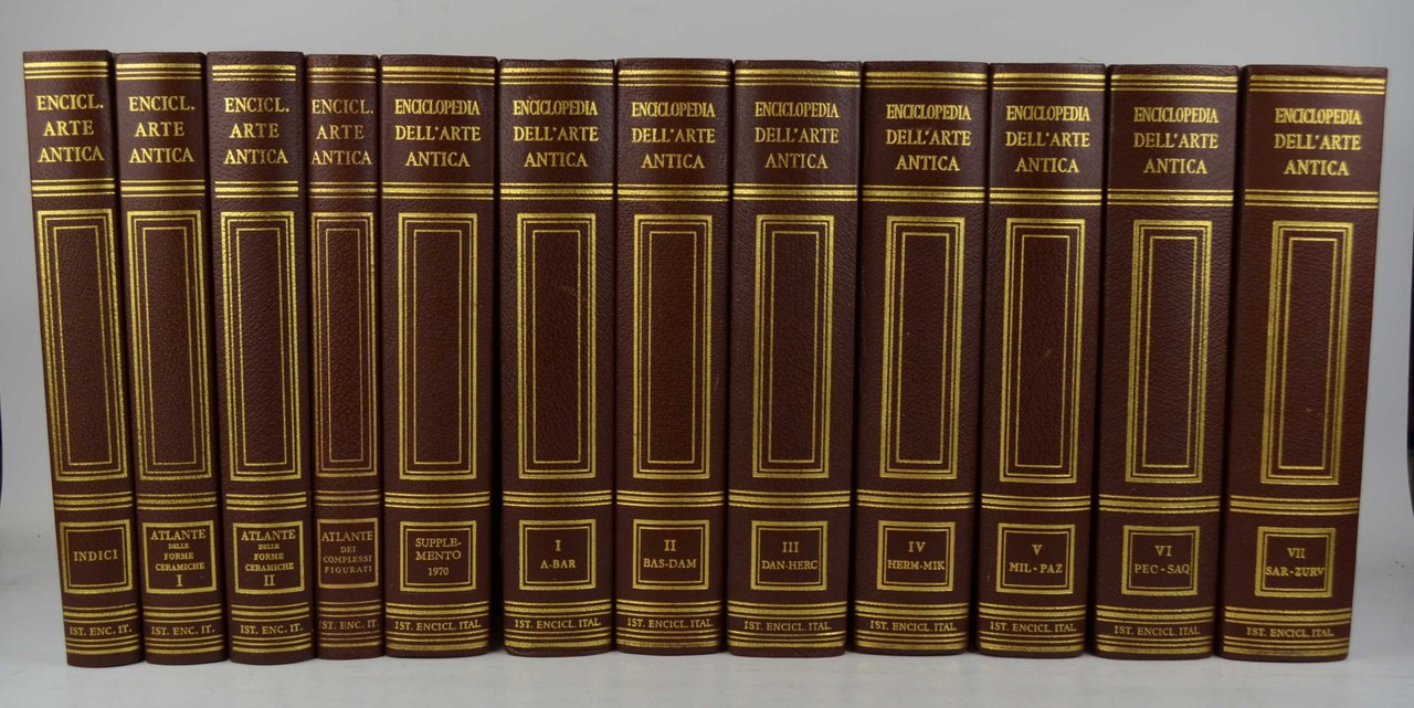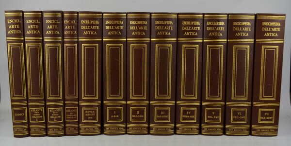 Dodici volumi di cm. 31, pp. migliaia di pagine complessive, profusamente illustrate. Legatura editoriale in mezza pelle con titoli e fregi in oro ai dorsi. Ben conservato. Comprende: corpus dell'opera in 7 volumi + indice, supplemento (1970) + atlante dei complessi figurati + atlante delle forme ceramiche (in 2 volumi).