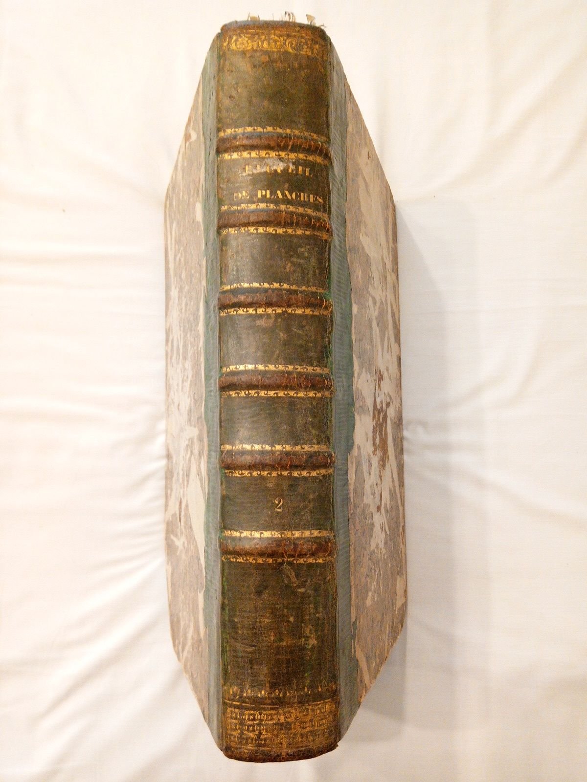 A Paris: Chez, Braisson, David, Le Breton, Durand, M. DCC. LXIII [1763].- TOMO II, Seconde Livraison, Seconde Partie [3º de la obra]: (2 h., 2 p., 31 p., 2 p., 4 p., 4 p., 1 h., 1 p., 2 p., 1 p., 1 p., 1 p., 1 p., 1 p., 3 p., 2 p., 1 p., 1 p., 1 p., 1 p., 1 p., 12 p., 1 p., 1 p., 2 p., 2 p., todas de texto) + 201 artísticas planchas magistralmente grabadas al cobre; en Gran Folio (40,5 x 17 cm); magnífica impresión sobre gran papel verjurado; Encuadernación en Media Piel época de color verde, lomera de 6 nervios con título y hierros dorados, cortes pintados en color granate, tapas o planos en papel de aguas.- CONTIENE los siguientes oficios y profesiones: Charron (8 planches), Chasses (23 pl.), Chauderonniers grossier, Planeur et Faiseur d'instrumens de Musique (4 pl.), Chimie (25 pl.), Chirurgie (39 pl.), Choregraphie (2 pl.), Blanchissage de cires (3 pl.), Cirier (4 pl.), Fabrique de la cire à cacheter (2 ), Ciseleur & Damasquineur (2 pl.), Cloutier grossier (2 pl.), Cloutier d'épingle (2 pl.), Coffretier-Malletier-Bahutier (3 pl.), Confiseur (5 pl.), Corderie (6 pl.), Cordonnier et Cordonnier-Botier (2 pl.), Corroyeur (2 pl.), Coutelier (2 pl.), Découpeur et Gaufreur d'étoffes (3 pl.), Dentelle et façon du point (3 pl.), Dessein (39 pl.), Diamantaire (3 pl.), Distillateur d'eau-de-vie (1 pl.), Doreurs sur meteaux, cuir et bois (4 pl.), Draperie (13 pl.).* EL INTERIOR EN PERFECTO ESTADO, TANTO PARA EL TEXTO COMO PARA LAS LAMINAS GRABADAS. Encuadernación de la época con el lomo de piel algo rozado, pero en muy buen estado general. Tapas restauradas de pequeñas faltas en las esquinas. Papel de aguas con diversas rozaduras. SOLO OFRECEMOS ESTE TERCER VOLUMEN de "Recueil des Planches, sur les Sciences, les Arts.". La obra completa consta de 11 volúmenes + los 17 volúmenes de "La Enciclopédie", a la que seguían. La estructura de la Encyclopedie, tanto en su diagramación, formato y, por supuesto, contenido ideológico, dio respuesta al complejo entramado de variables que supuso ese proceso disparador de nuevas ideas, inteviniendo intelectuales como Voltaire, Buffon, Montesquieu, D'Alembert, Quesnay, Turgot, d'Holbach, Rousseau, de Jacourt y por supuesto Diderot; proceso también rompedor de los secretos tecnológicos del cerrado universo de las corporaciones gremiales del modo feudal de producción. En este sentido la obra presenta dos núcleos entrelazados: el Diccionario y las Planchas. Sin embargo hay que reconocer que la potente originalidad está concentrada en "Recueil des Planches, sur les sciences, les arts liberaux et les arts mechaniques, avec leur explication", en que se despliega, a través de descripciones gráficas y de textos aclaratorios, una impresionante cascada de datos sobre la situación, fundamentos y perspectivas de las técnicas, oficios y talleres. EN DEFINITIVA OFRECEMOS EL TERCER VOLUMEN DE "RECUEIL DES PLANCHES.", SIN DUDA LA MAS GRANDE Y AMBICIOSA PRODUCCIÓN EDITORIAL DE LA FRANCIA DE LA ILUSTRACION. EN CONJUNTO CONTIENE 202 IMPRESIONANTES PLANCHAS GRABADAS AL COBRE POR LOS MEJORES ARTISTAS DEL MOMENTO, ALGUNAS A DOBLE PAGINA. TODAS ELLAS CONSERVADAS PERFECTAMENTE. "Todavía no se ha hecho, ni durante mucho tiempo se hará, una colección tan considerable y tan hermosa de máquinas" (Diderot). FILOSOFÍA E HISTORIA DE LA CULTURA