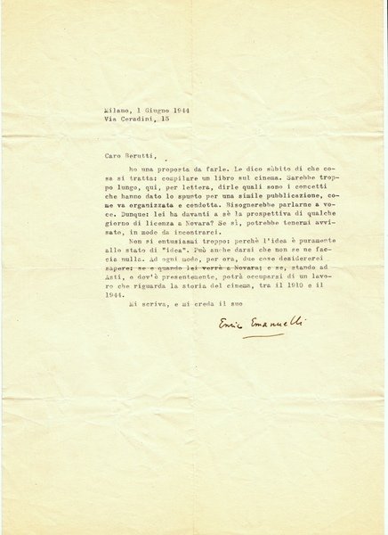 comunicazione firmata di Enrico Emanuelli completa di busta di 1 facciata Milano, 1 Giugno 1944; buon es.