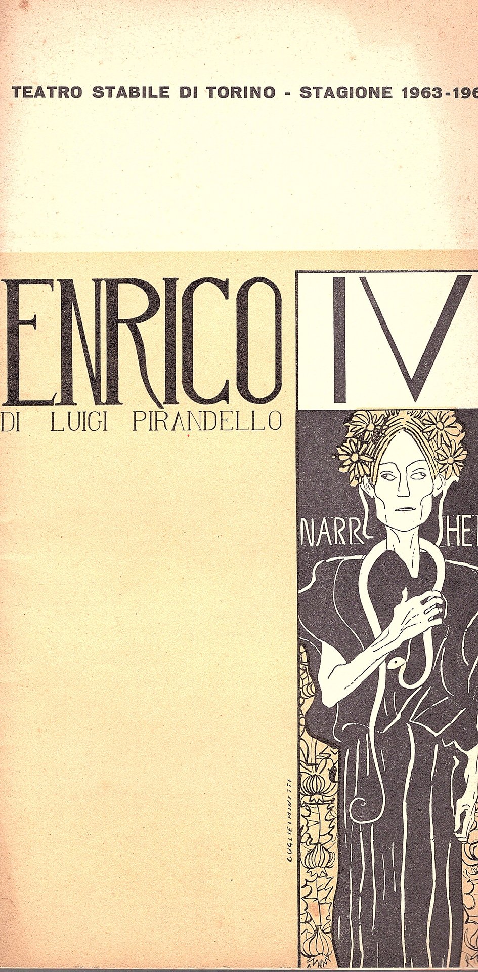 In-4° (29x15.5 cm), brossura editoriale spillata con titoli al piatto anteriore e paratesti al posteriore e ai contropiatti. Pp (30), figure e foto di scena in bianco e nero nel testo e fuori testo. Lievi segni del tempo e d'uso ai piatti. Più che buon esemplare. Programma di sala della messa in scena a cura di José Quaglio della tragedia pirandelliana con scene e costumi di Eugenio Guglielminetti; Silvio Randone è Enrico IV e Neda Neldi è la Marchesa Matilde Spina. Uno dei dieci spettacoli in cartellone del sesto anno di vita del teatro stabile torinese vera e propria fucina e crocevia di idee della scena italiana degli anni sessanta insieme alle mostre organizzate dalla GAM. Tale lavorio culturale si avverte tangibilmente nella estrema cura della veste grafica e nell'impaginazione oltre che dei contenuti dei programmi dei singoli spettacoli.