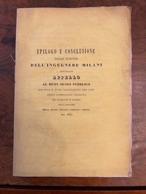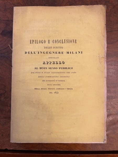Epilogo e conclusione dello scritto dell'ingegnere Milani intitolato Appello al buon senso pubblico sul voto e sulle illustrazioni del voto della commissione nominata per opinare se pel tratto tra Brescia e Milano della strada ferdinandea Lombardo-Veneta debbasi preferire la linea per Chiari e Treviglio colla diramazione da Treviglio a Bergamo oppure l'altra per Bergamo e Monza | Libri antichi e moderni | Milani