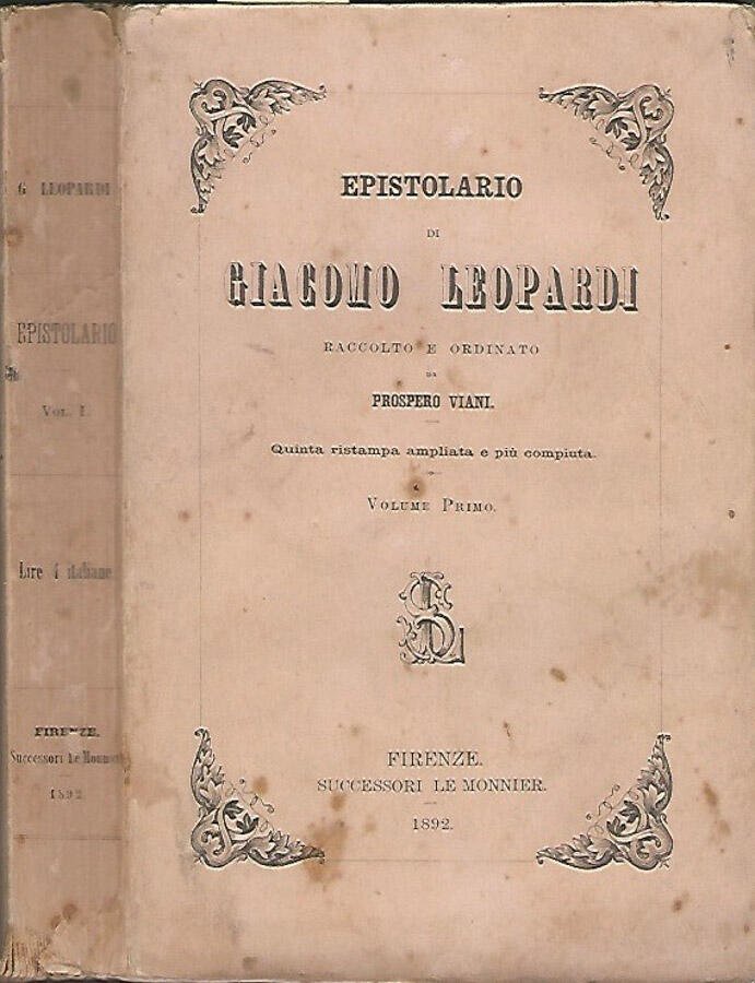 Volume primo di opera incompleta. Epistolario di Giacomo Leopardi raccolto e ordinato da Prospero Viani. Legatura editoriale, copertina flessibile in cartoncino evidentemente segni del tempo, con strappi lungo la cerniera esterna, fioriture sparse, gore visibili al piatto posteriore. Pagine ingiallite, con fioriture accese. Quinta ristampa ampliata e più compiuta. Numero pagine 567.