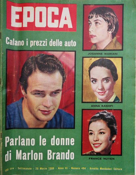 Numero "494" della rivista settimanale "Epoca" dell'anno XI, rispettivamente 20 marzo 1960. La copertina, presenta segni di usura ai margini con tracce di decolorazione agli stessi ed un leggero ingiallimento su ambo i piatti. Pagine lievemente brunite con occasionali macchioline marroni ed illustrazioni a colori ed in bianco e nero. Numero Pagine 90
