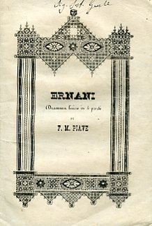 In-16°, pp. 36, brossura originale con titolo entro bordura ornamentale e firma del tempo. Ottima copia. Libretto di metà Ottocento dell'Ernani', la cui prima rappresentazione si era svolta alla Fenice di Venezia l'11 febbraio 1844. L'interprete di Ernani, in questa prima rappresentazione alla Scala, era Carlo Guasco, il direttore d'orchestra fu Eugenio Cavallini.