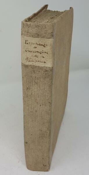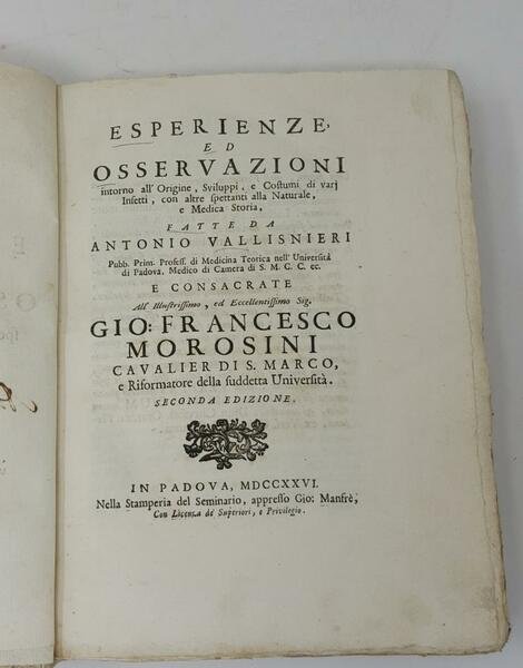 2 opere in 3 parti in un vol. in-4, legatura coeva cart. rustico, tit. ms. al dorso. Con complessive 15 tav. inc. in rame f.t. (le stesse della prima ediz., così distribuite: 10 nelle 'Esperienze ed osservazioni' e 5 nella 'Nuova giunta') ed una vignetta inc. a pag. 105 della 'Nuova giunta'. - I) Esperienze ed osservazioni intorno all'origine, sviluppi e costumi di varj insetti., pp. (8), 232.- II) Nuove osservazioni, ed esperienze intorno all'ovaja scoperta ne' vermi tondi dell'uomo, e de' vitelli., pp. (16), 184. (Segue:) Nuova giunta di osservazioni, e di esperienze intorno all'istoria medica, e naturale, non solamente del Sig. Vallisnieri, ma di altri celebri autori, a lui scritte., pp. (4), 128. Seconda edizione di ambedue le opere, ma prima edizione della 'Nuova giunta'. "Per la prima volta vengono pubblicate alcune lettere di carattere scientifico, tra Vallisnieri e altri uomini di scienza contemporanei: ogni animale nasce dall'uovo, ed ogni pianta dal seme.". Cfr. Sabia nn. 193, 194 e 195. Ottimo esempl., a pieni margini (con qualche pagina brunita), arricchito della dedica autografa del Vallisnieri vergata sul primo occhietto: 'All'Ill.mo Sig. Francesco Palazzi l'autore in segno di riverente stima , e di eterna amicizia' (con ogni probabilità il noto antiquario romano della Rev. Camera Apostolica e del Campidoglio, possessore di una ricca pinacoteca). .