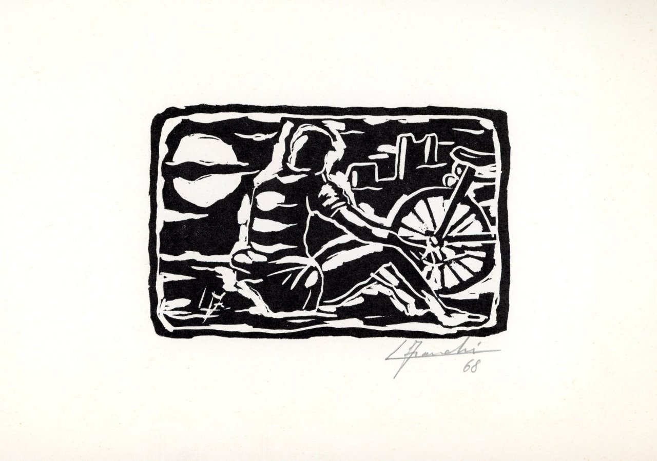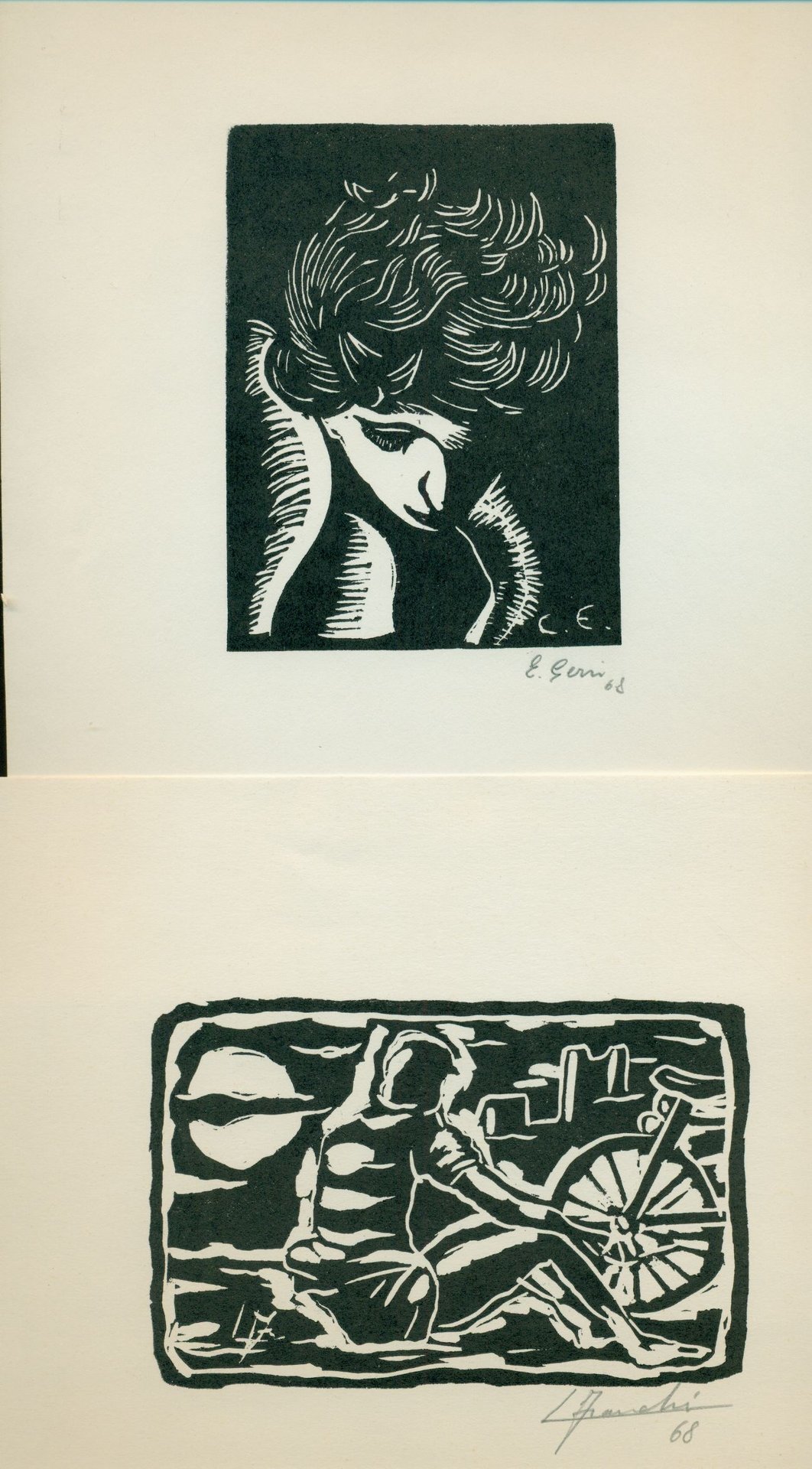 Plaquette/Invito della mostra alla Galleria d'Arte Campi, Cremona, 18 maggio - 1 giugno 1968. Cartelletta con 2 xilografie originale firmate a matita dagli artisti. Note biografihe . 8vo. pp. 2. . Molto buono (Very Good). . Edizione di 350 esemplari. .